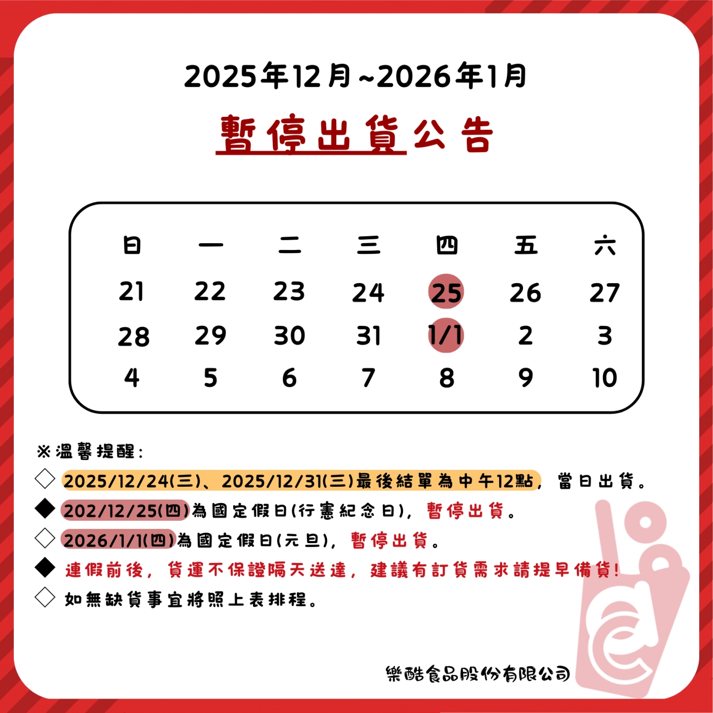 2025/12/25(四)為國定假日(行憲紀念日),暫停出貨。 2026/01/01(四)為國定假日(元旦),暫停出貨。 ★假期前後,貨運不保證隔天可送達,建議有訂貨需求請提早備貨! 其他提醒事項詳見公告圖,謝謝~