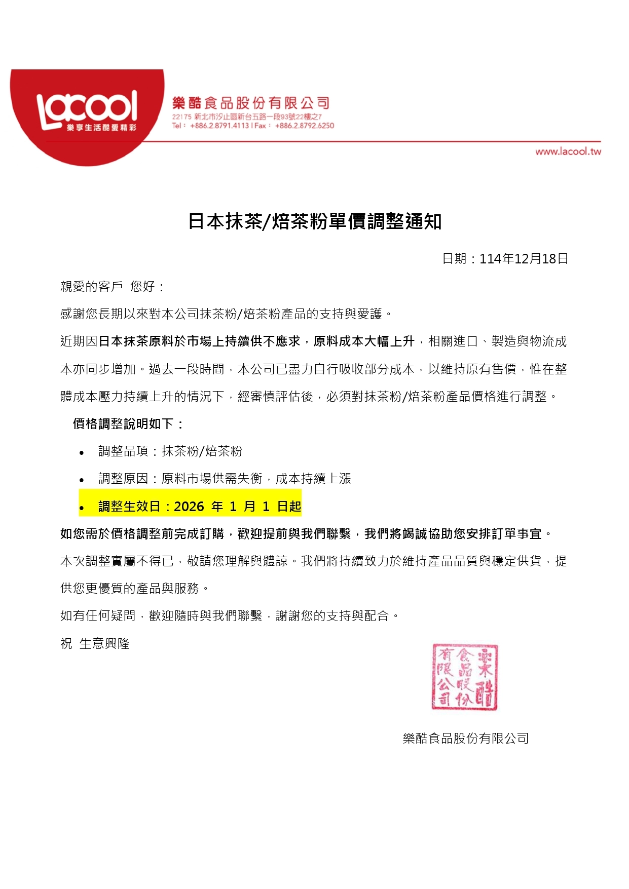 日本抹/焙茶粉單價調整公告