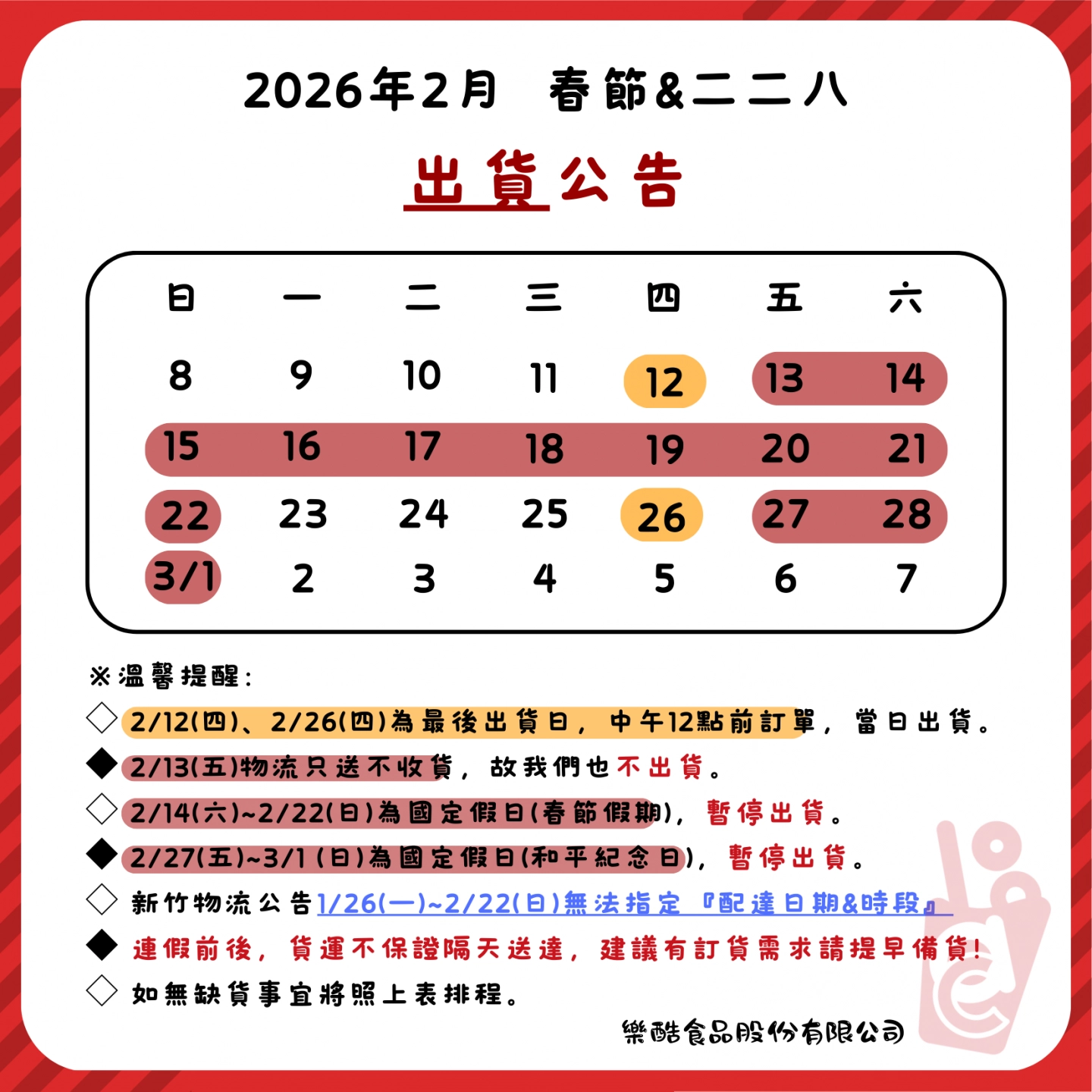 2/12(四)、2/26(四)為最後出貨日,中午12點前訂單,當日出貨。