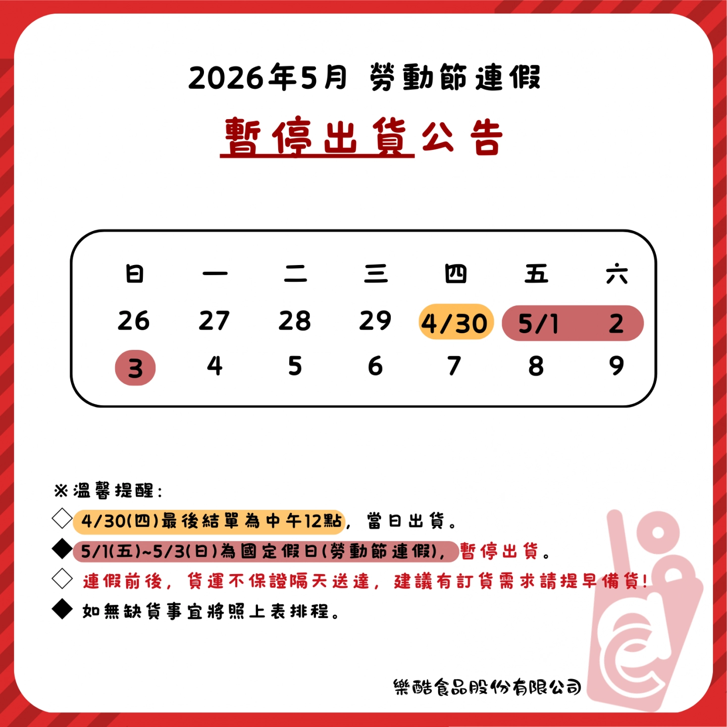 2026年5月勞動節連假 出貨公告